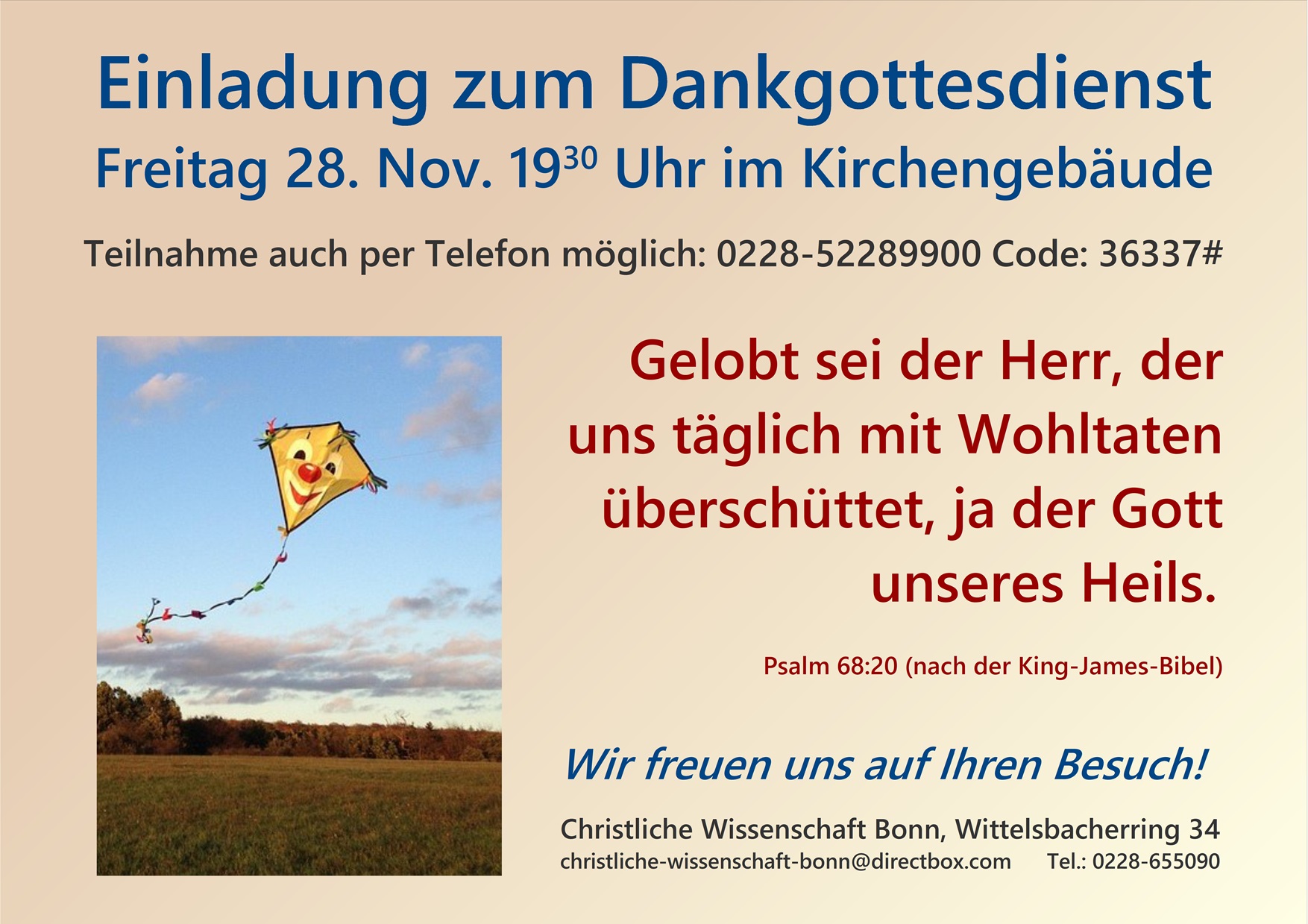 Jeden Mittwoch um 19:30 Uhr findet eine Zeugnisversammlung statt. Wir geben hier Zeugnis von der heilenden und erneuernden Macht der Wahrheit. Gelegenheit für Gespräche, schauen Sie einfach mal herein.